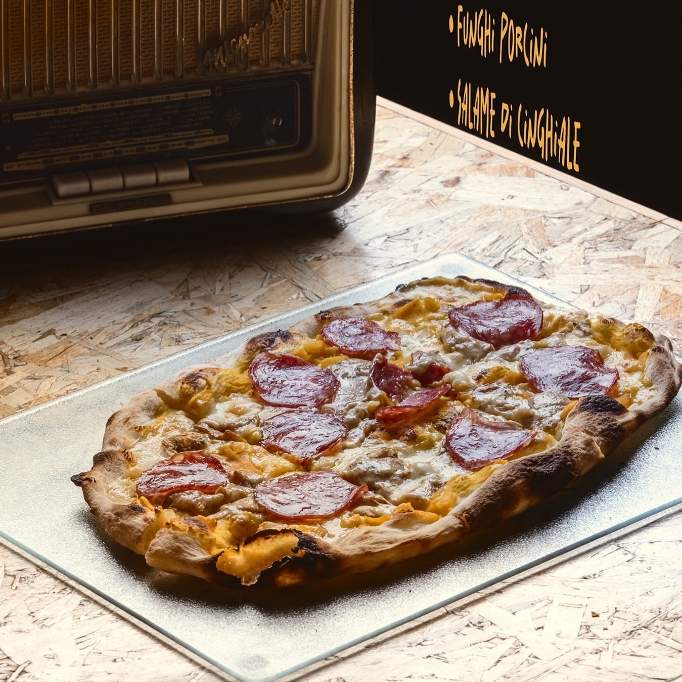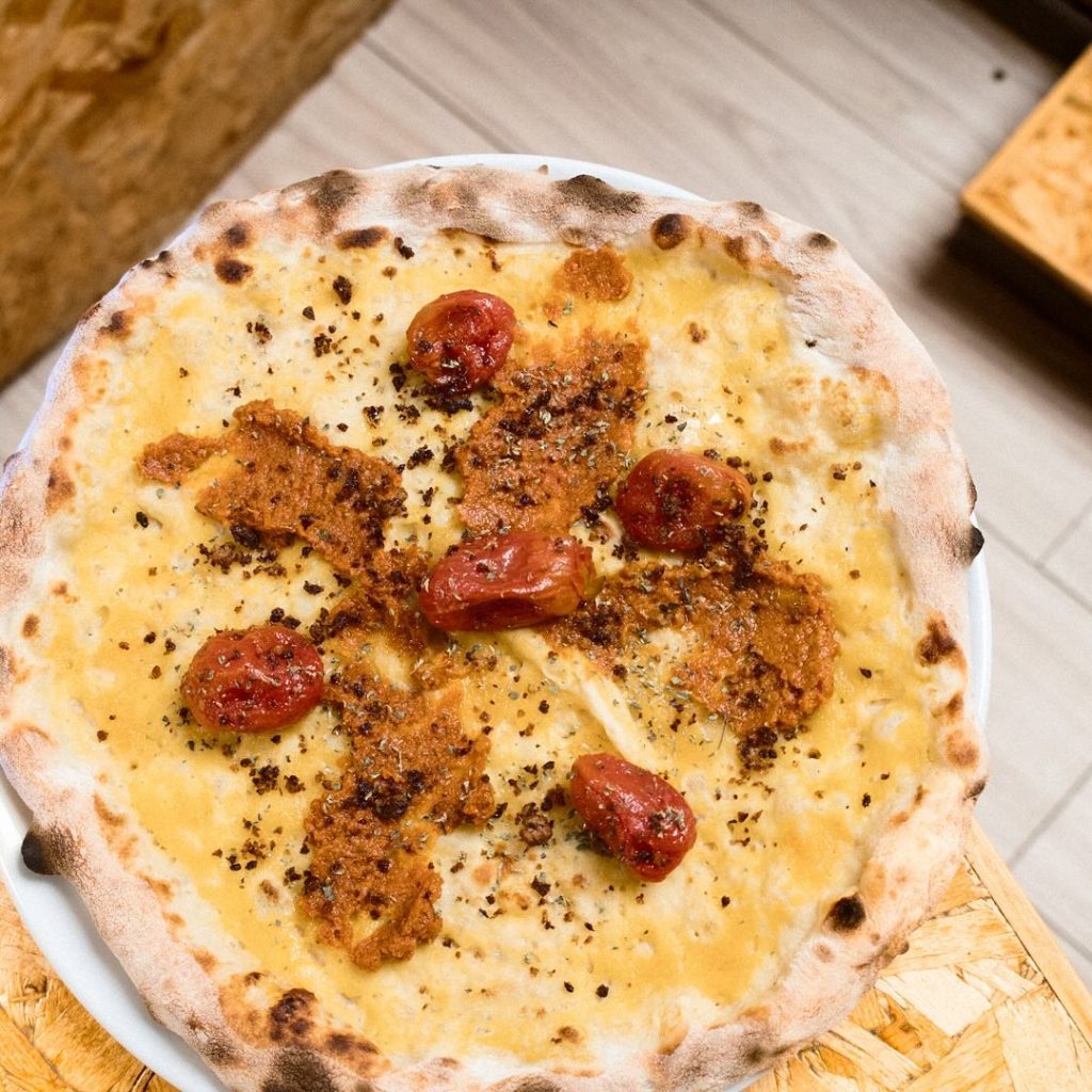 Crema di funghi champignons, mozzarella fior di latte Murgella, gorgonzola DOP, funghi cardoncelli, funghi porcini, speck dell’Alto Adige