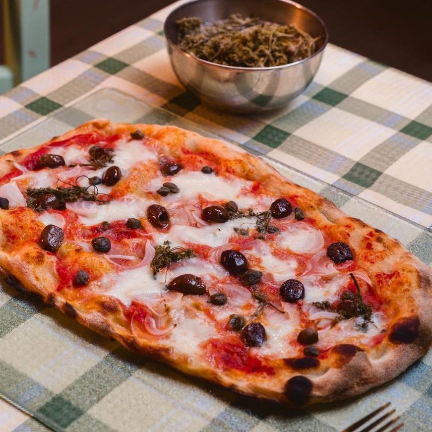 Pomodoro 100% Salentino APS SolidaTerra, mozzarella fiordilatte Murgella, cipolla, capperi, olive leccine, caroselle