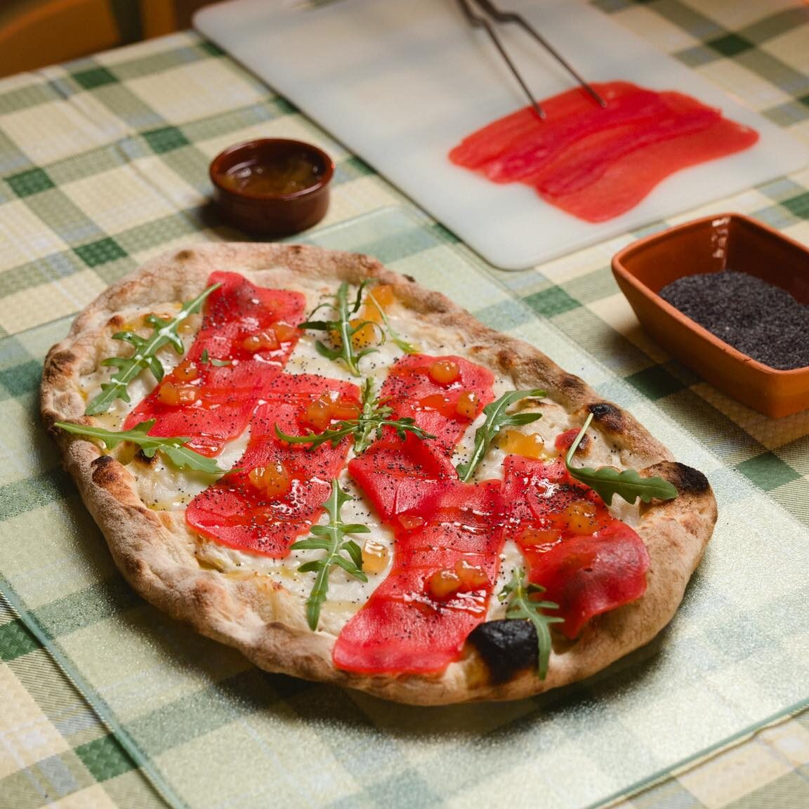Crème fraîche, mozzarella vegan bio, salmone vegan, alga nori, composta pere e zenzero, rucola, semi di papavero.