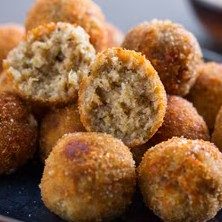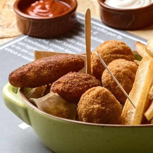 2 pezzi supplì pomodoro mozzarella, 2 pezzi polpette di melanzane, 4 pezzi crocchette di patate, anelli di cipolla