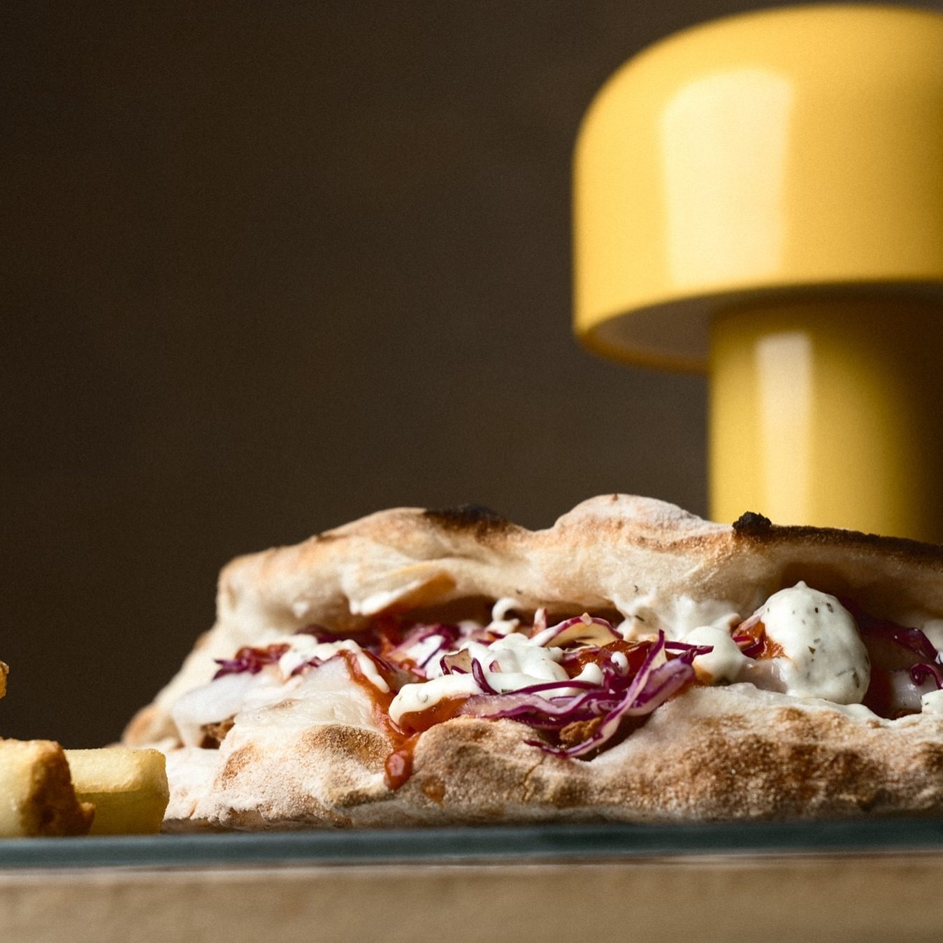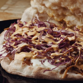 Mozzarella vegan, pulled seitan, cipolla caramellata, coleslaw